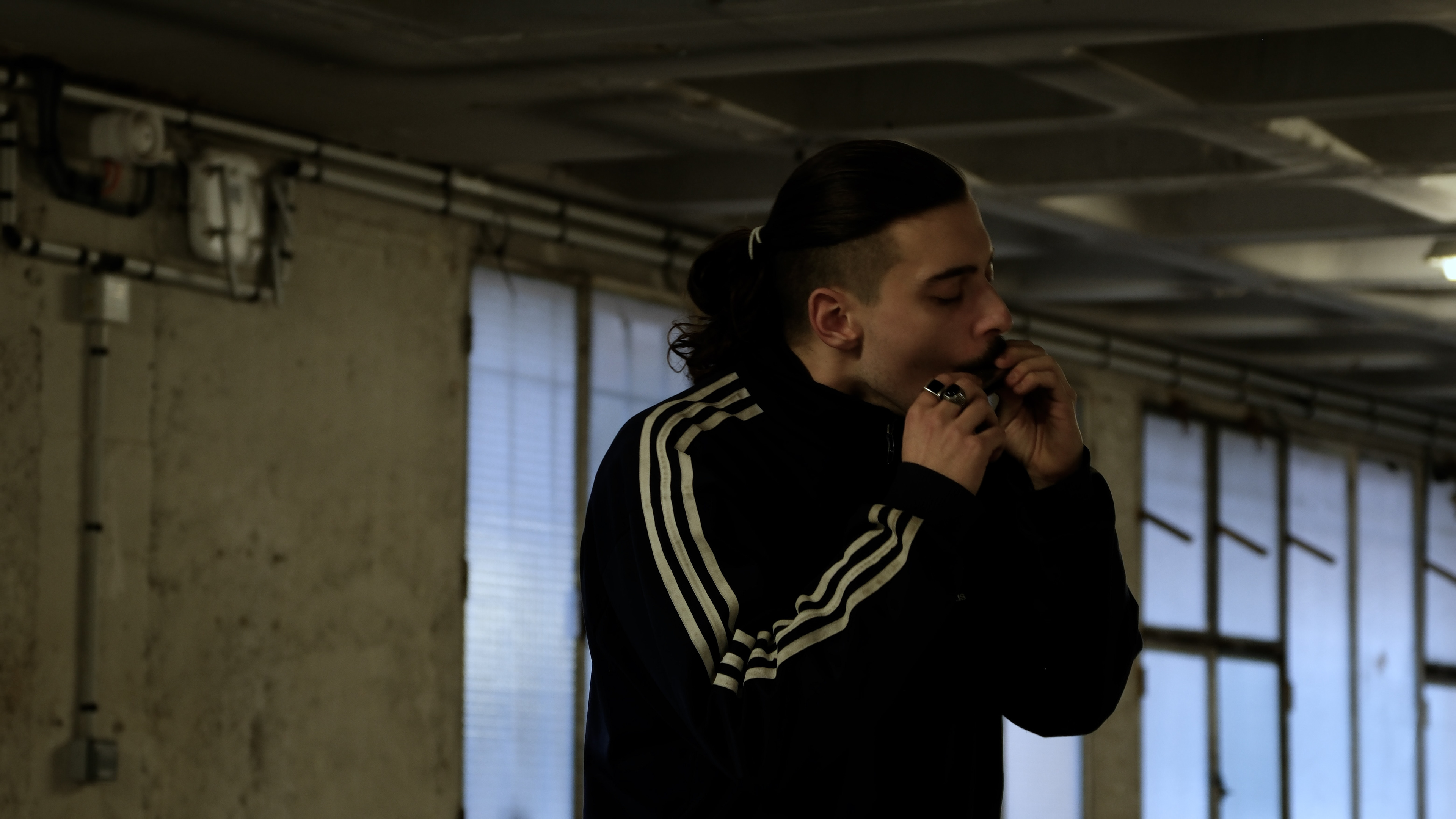 Aujourd’hui, plus personne ne joue. J’ai choisi de jouer — sans savoir en jouer — comme geste de réactivation. Mon protocole est d’inspirer et expirer uniquement à travers l’harmonica, jusqu’à ce que mon rythme cardiaque s’accélère et que mon corps vacille. Chaque souffle fait vibrer le lieu : l’ancienne usine devient caisse de résonance, le bâtiment tout entier s’active par le souffle et le rythme de l’instrument. Le geste est répétitif, et se déploie dans un espace qui n’est pas un lieu d’exposition, mais devient un instrument en soi.