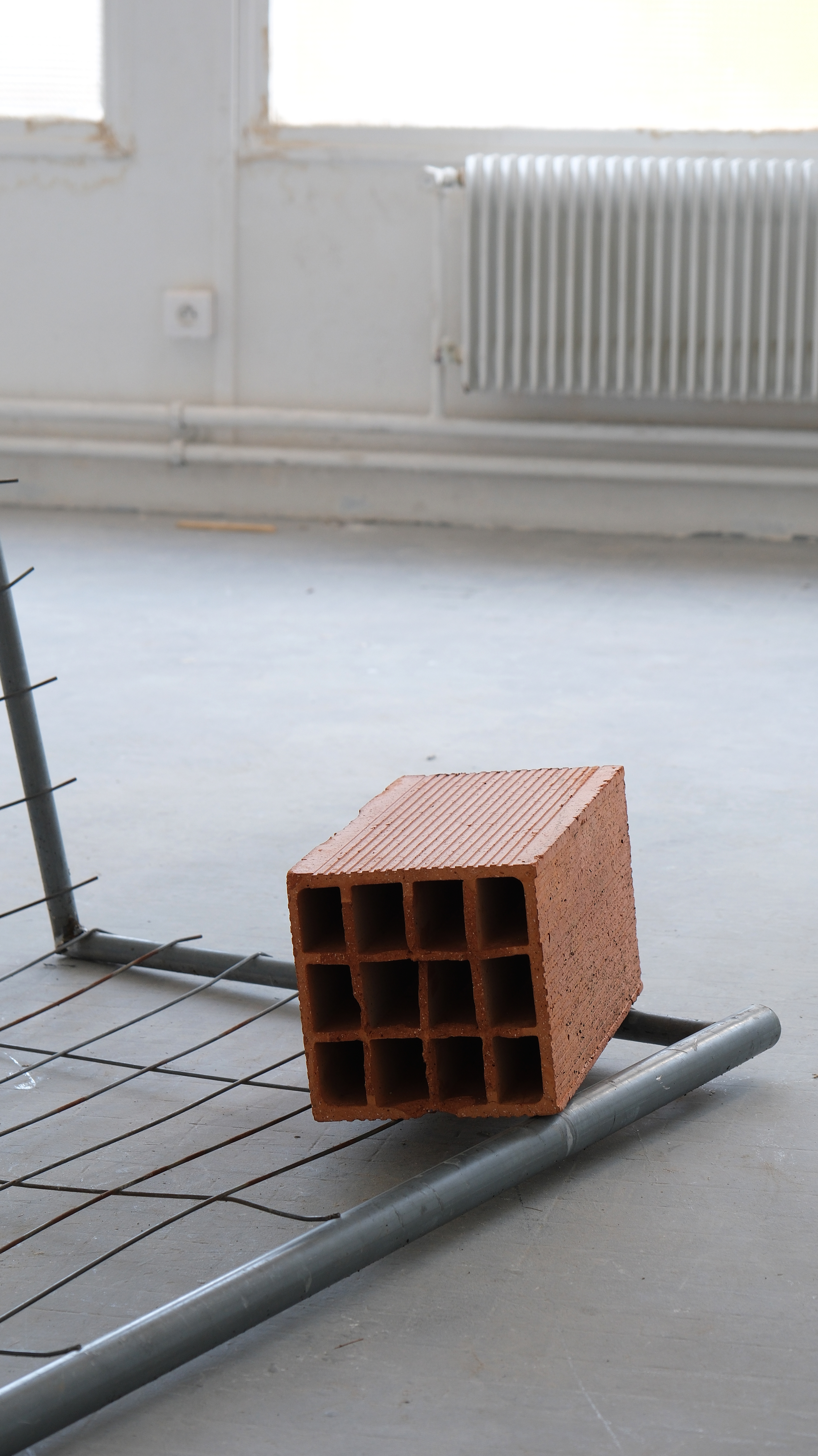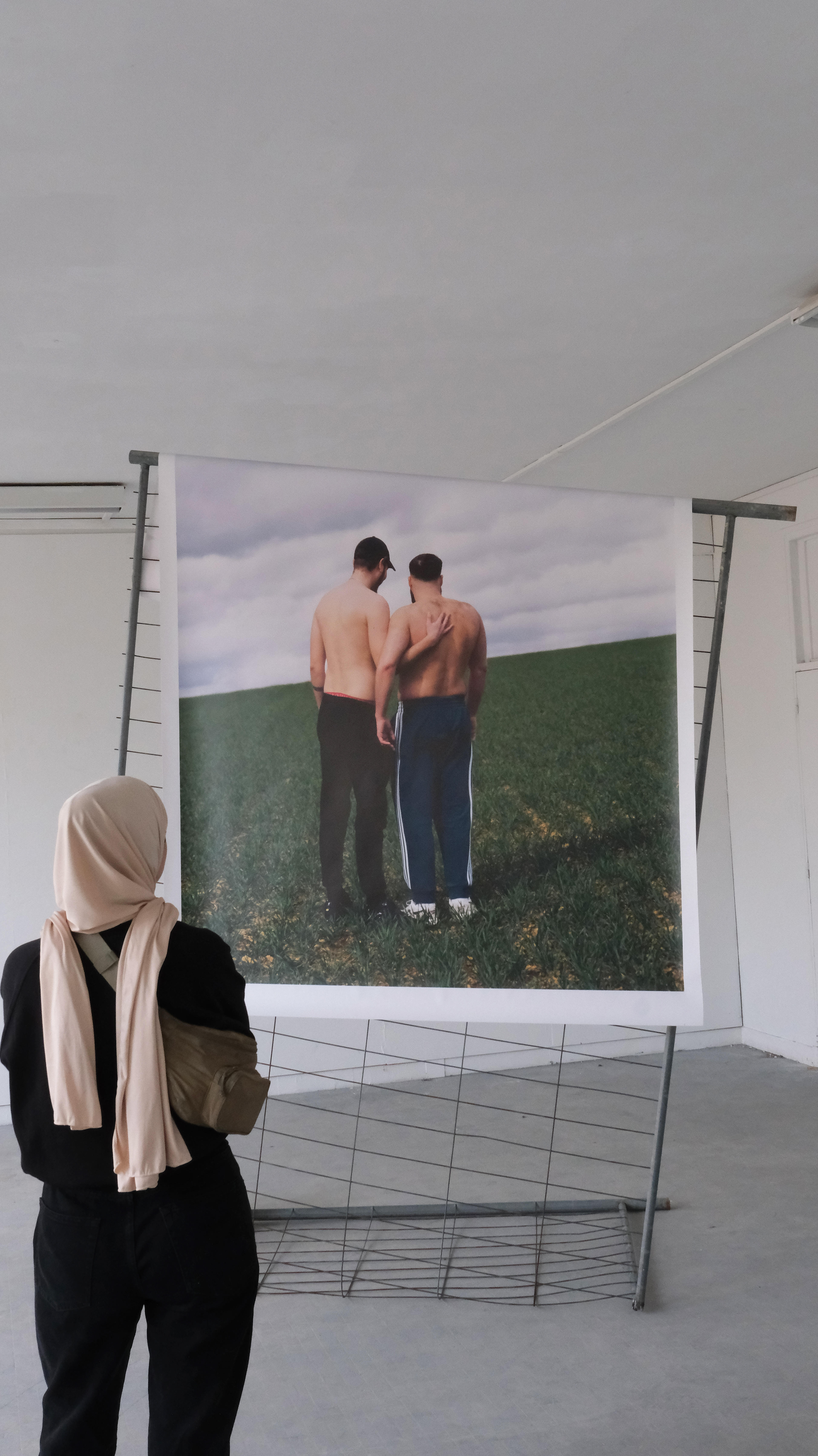 Cette pièce propose deux modes de monstration. Dans l'un, l'image repose sur une barrière de chantier tordue et cassée, qui devient le socle de cette sculpture photographique. L'image y tient en équilibre. Dans l'autre, elle est accrochée de manière plus minimale, directement au mur, nous confrontant frontalement à cette scène, à cette histoire.